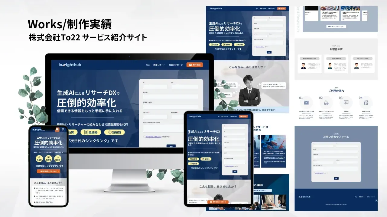 株式会社To22が提供するサービス「Insighthub」のLPを制作させていただきました。ファーストビューにフォームを埋め込み、問い合わせしやすい設計にしています。