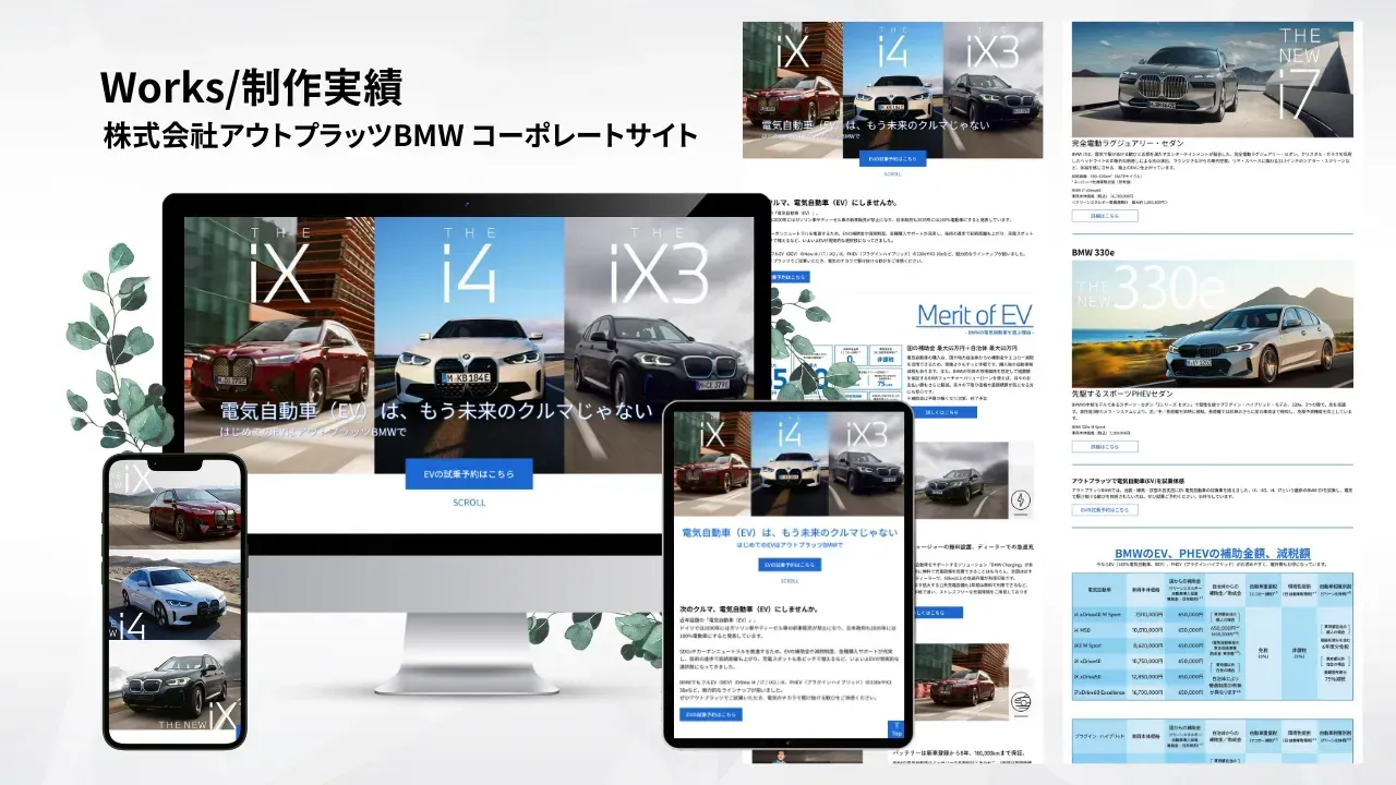 株式会社アウトプラッツのコーポレートサイトを制作させていただきました。ファーストビューに特徴的なアニメーションを付けることで印象に残るサイトにしています。