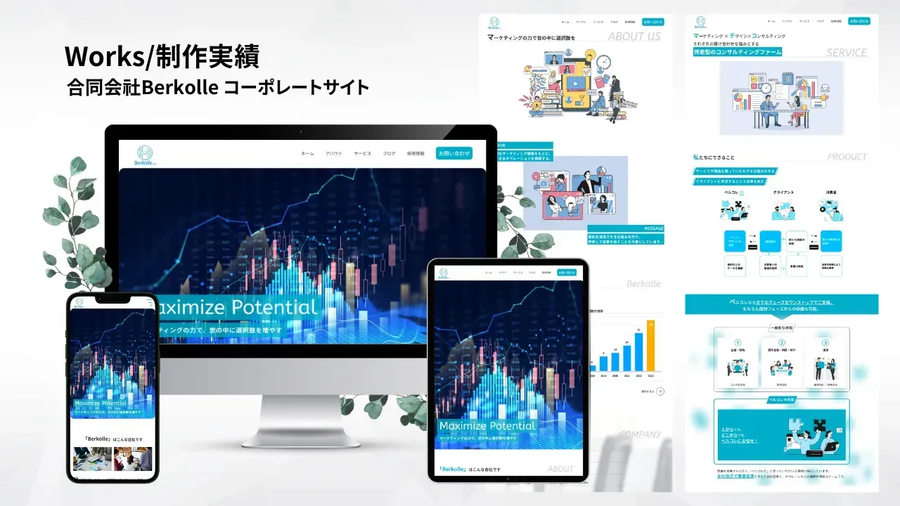 合同会社Berkolleのコーポレートサイトを制作させていただきました。イラストを使いつつ先進的な社風が想像できるサイトに仕上げています。